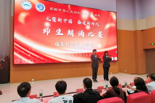 为庆祝中华人民共和国成立75周年,凝聚团结奋进力量,9月28日晚,云顶线上娱乐城-在线娱乐城 举办“礼赞新中国 奋进新时代”师生朗诵比赛。校关工委副秘书长王敦琴、云顶线上娱乐城-在线娱乐城 关工委常务副主任周晖、云顶线上娱乐城 组织部组织科科长张伟佳、校学生工作处学生管理科科长黄小波、信息科技术云顶线上娱乐城 党委纪检委员沈晓燕、人工智能与计算机云顶线上娱乐城 陈善俐老师、通信211班陆杨应邀担任评委。云顶线上娱乐城 书记周平,云顶线上娱乐城 副书记、副院长陈馥强,院团委书记徐婕,全体辅导员,教师及学生代表参加活动。