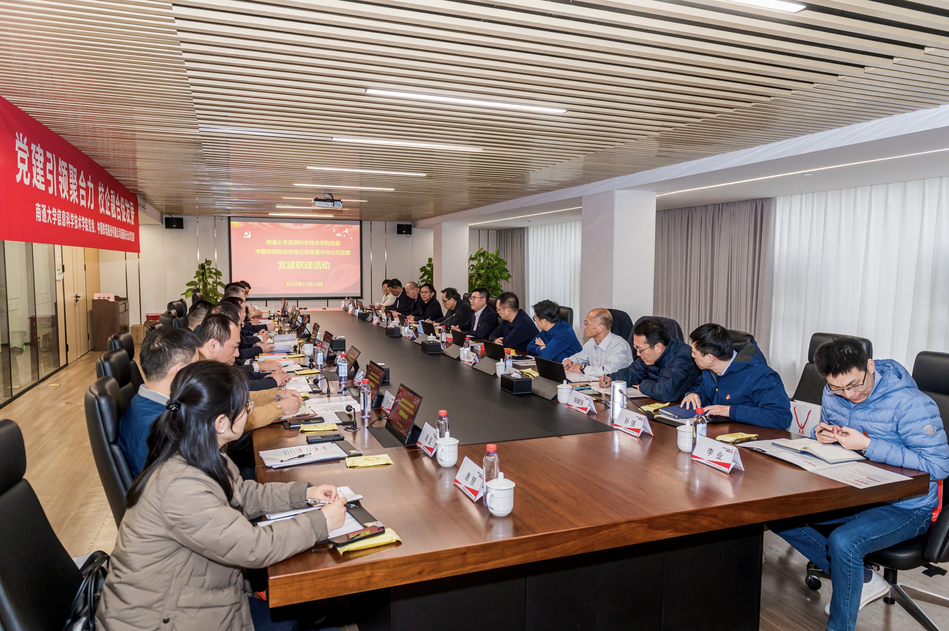 王建浦代表南通大学,向中国铁塔股份有限公司南通市分公司的热情接待表示感谢,向双方长期以来在网络通信建设、科研合作和人才培养等方面取得的积极成果表示祝贺。王建浦指出,中国铁塔是我国移动通信基础设施建设的主力军,拥有丰富的行业经验和技术积累,与云顶线上娱乐城 在人才培养、科技创新等方面有着广泛的合作空间和共同的发展愿景。云顶线上娱乐城-在线娱乐城 党委与中国铁塔股份有限公司南通市分公司党委开展党建共建,并围绕加快高水平科技自立自强,引领发展新质生产力开展理论联学,既是政治学习的深化,也是校企合作的再升级,更是共谋新质生产力的务实之举。王建浦就推动深化双方合作提出四点要求:一、强化党建引领,把牢共进方向。必须始终将坚持和加强党的全面领导贯穿于合作的全过程、各环节,将党的政治优势、组织优势转化为推动校企协同发展、服务国家战略的强大动力。二、锚定新质生产力,抢抓战略机遇。聚焦南通新质生产力领域,加强科研攻关和技术转化,推动校企资源同频发展。三、推动资源互补,构建协同格局。通过共建科研平台、共育人才和共助地方发展,实现校企资源、智慧和力量的协同互补。四、坚持真学实干,健全长效机制。将理论学习与科研、人才培养和社会服务深度融合,推动党建联建从一次性活动走向长期合作的机制。